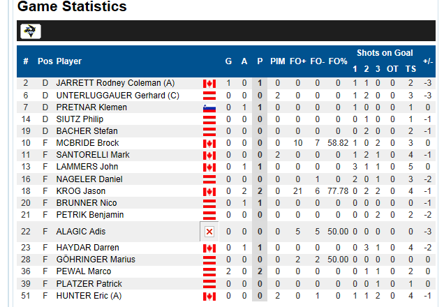 Lugge und Jarret unser Pensionistenpärchen waren durch ihren fehlenden Speed sicherlich für 3 Tore verantwortlich ( bei zeiten schau ich nach bei wievielen Gegentreffern die am Eis standen ) und wurden mit mehr Eiszeit belohnt, dass die zum Ende des Spiels eingebrochen sind, zeigt zu einen dass ihre Zeit vorbei ist aber auch dass sie das Sommertraining mit den E-Bike absolBIERt haben.