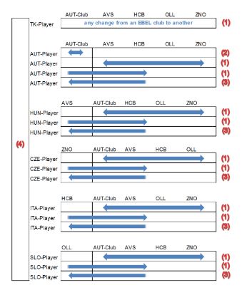 • Nationaler Spielerwechsel von einem internationalen zu einem nationalen EBEL-Verein (zB SLO-Spieler wechselt von einem AUT-Verein zu einem SLO-Verein):Es gilt die Regelung in Absatz (3) und Absatz (4)
