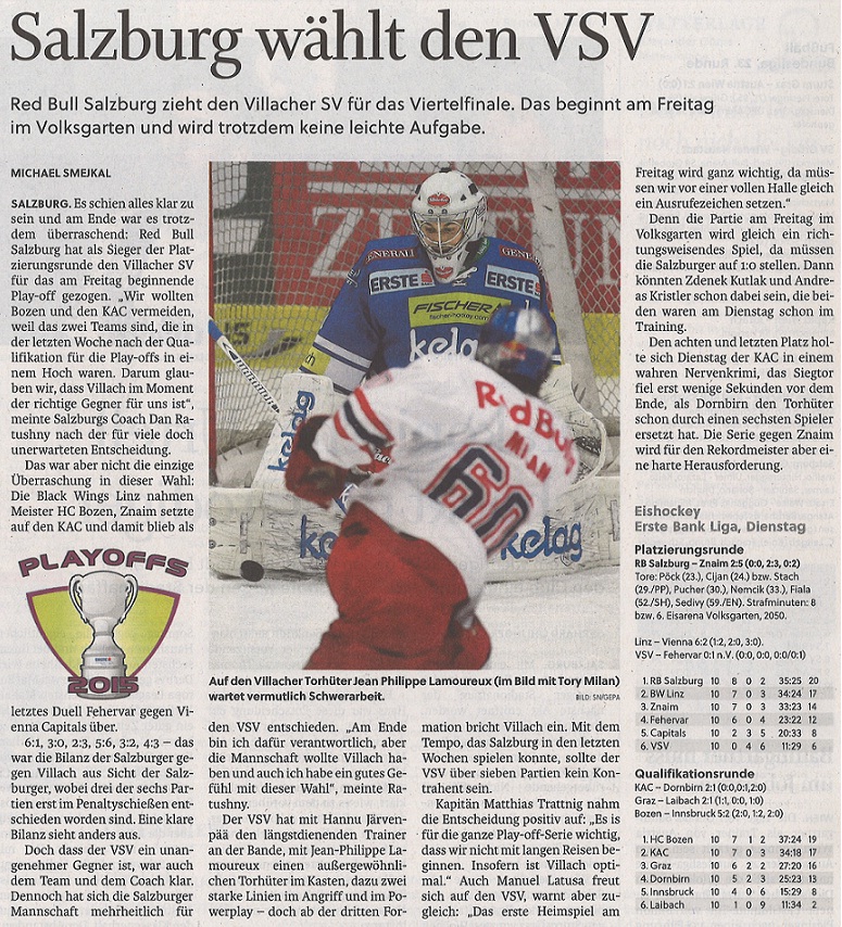 Ich gehe jetzt einfach mal davon aus, daß unsere Salzburger die Serie gewinnen werden, wobei es eng werden kann, wenn die Villacher zur Form vor Weihnachten zurückfinden und einen Lamo in Topform haben, wenn die Villacher im Leistungsniveau der vergangenen Wochen weiter agieren, dann sehe ich überhaupt kein Licht für Villach. Für die neutralen Fans wäre die knappe Serie natürlich interessanter, ich hoffe auch, daß die Salzburger gefordert werden um ordentlich in Playoff Rythmus zu kommen.
