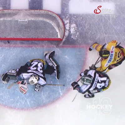 Also mMn kommt der Puck über den rechten Arm vom Goalie und ev. dessen verlängerten Rücken aufs Tor - "am Boden liegen" ist eher weniger der Fall.
