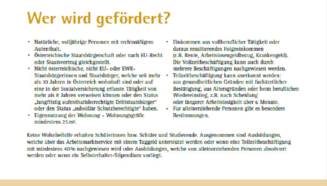 Wohnbeihilfe wird nur bei "Vollzeitbeschäftigung" gewährt, bei "Teilzeitbeschäftigung" nur, wenn sie aus gesundheitlichen Gründen (Facharztbestätigung) oder aus Altergründen erforderlich ist; oder beim Wiedereinstieg in das Arbeitsleben zB nach einer Scheidung bzw nach längerer Arbeitslosigkeit (länger als 6 Monate).