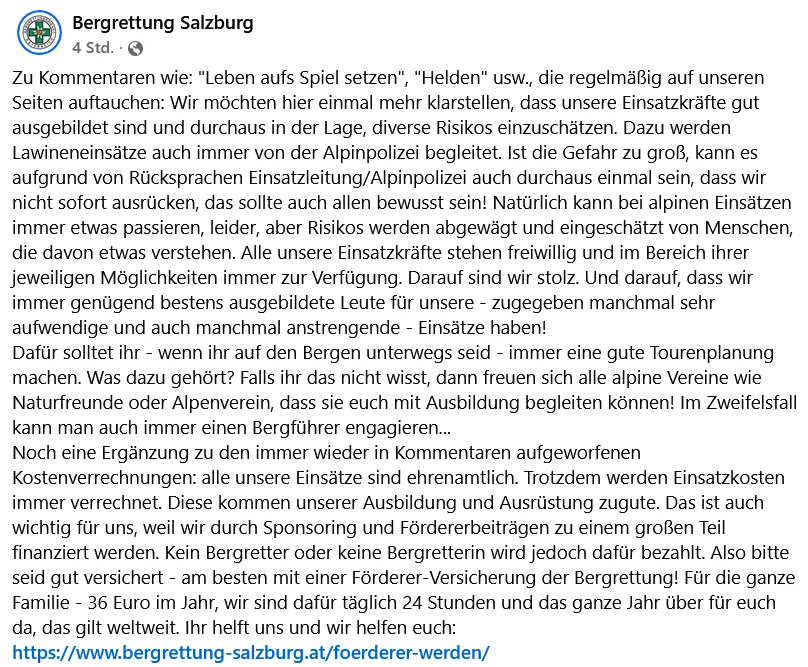 ...zum Thema "Retter, die sich selbst in Lebensgefahr begeben" eine wie ich finde sachliche und sehr passende FB-Aussendung der Landesleitung der Salzburger Bergrettung: