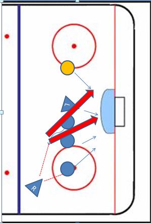 Dabei passiert es dann sehr oft; dass der scheibenführende Spieler zu lange verzögert und auf Grund der Laufwege, wie oben beschrieben, sich dann alles Richtung Tormann bewegt. Wenn der Verteidiger den Passweg unterbindet und durch Screening auch noch bewirkt, dass der Scheibenführende nach außen gedrängt wird, bleibt dem Stürmer nur mehr die Möglichkeit des Schusses.