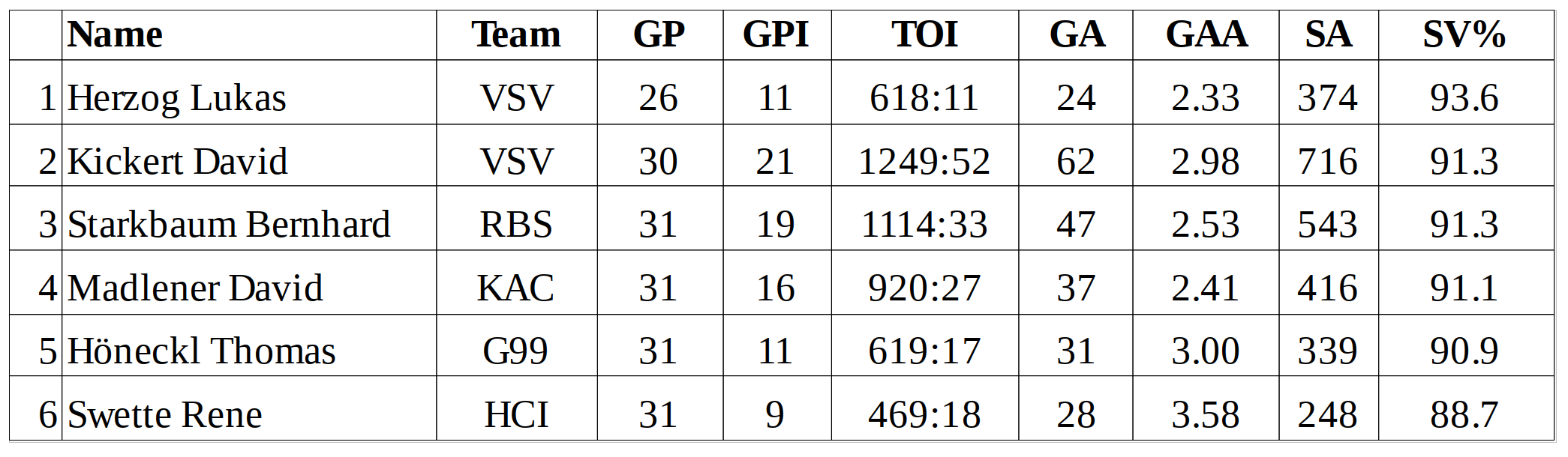Hab mir interessehalber auch mal die EBEL Statistik angesehen, und auf österr. Kepper bereinigt. Sortiert nach SV%: