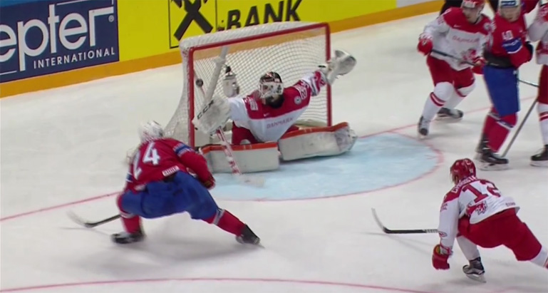 Und stimmt, der gute Sebastian Dahm spielt eine hervorragende WM, er ärgert sich vermutlich schon wegen der Verlängerung in Graz. Es ärgern sich aber auch diverse gegnerische Stürmer, die er auf der Uhr hat.