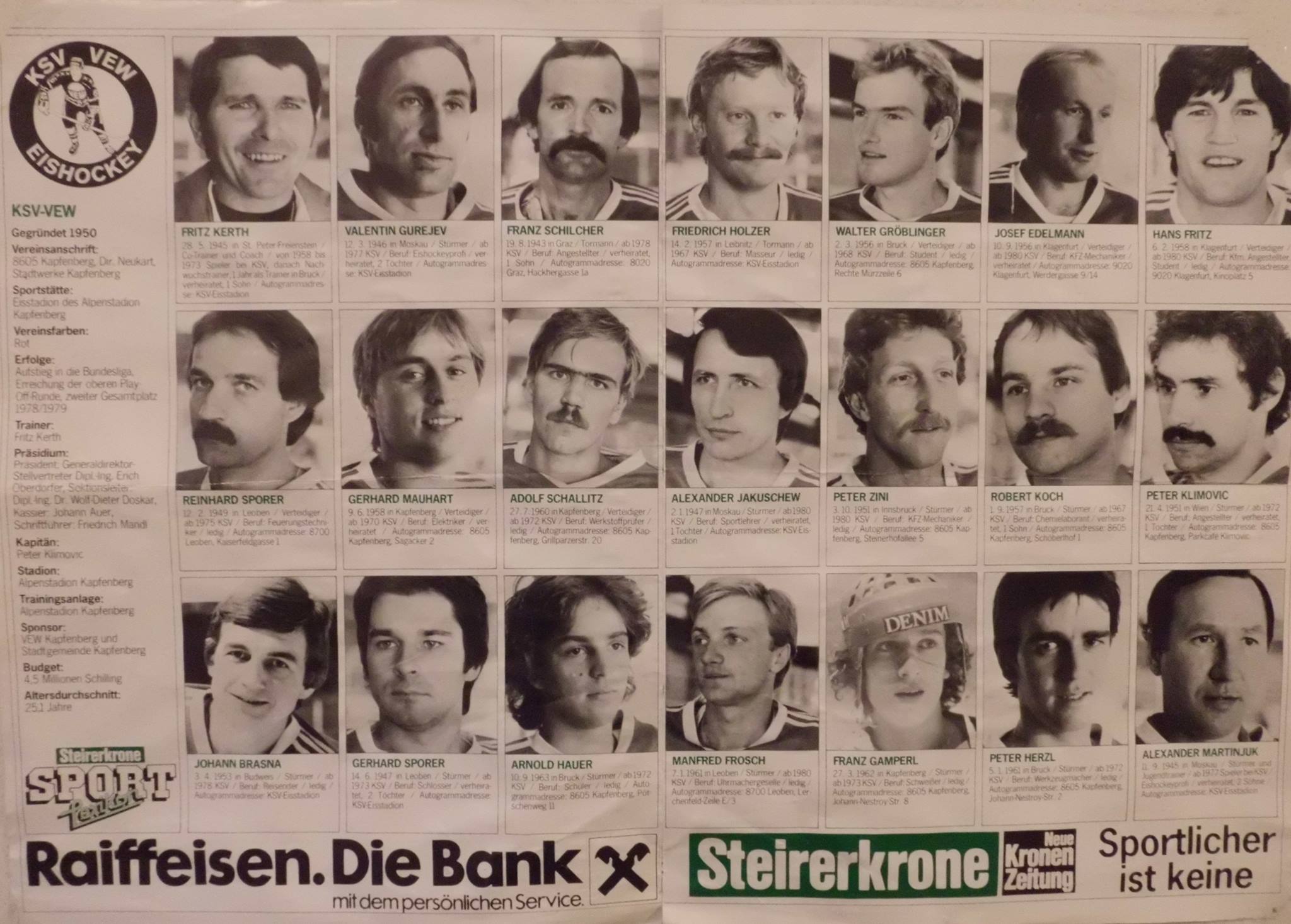 Ich eröffne mit einem Mannschaftsfoto des KSV und einer Mannschaftsaufstellung in der Krone von 1980 (Fotos gepostet mit Erlaubnis des Urhebers aus der Facebook-Gruppe "Kapfenberg - Nostalgie"):