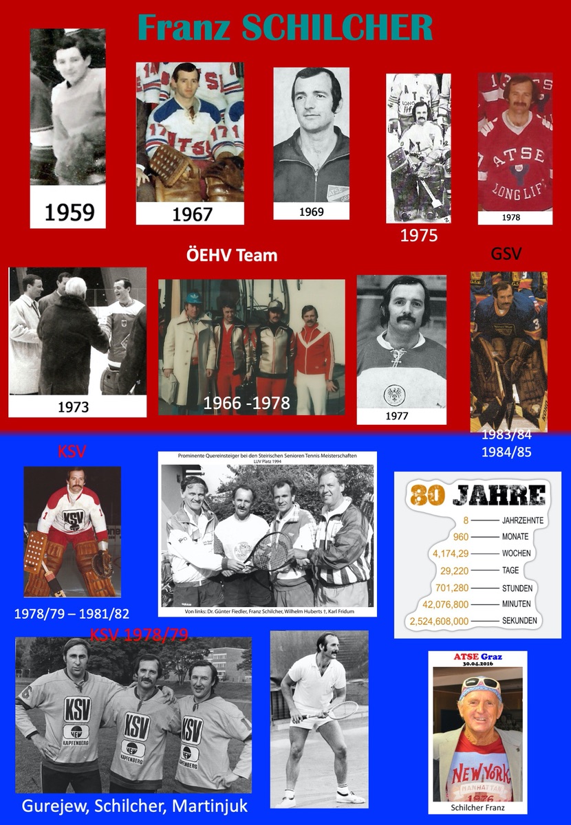 Am 19.08.2023 feierte mein Bruder Franz Schilcher seinen 80. Geburtstag. Franz spielte schon 1957 beim ATUS Eggenberg. Zuerst im Nachwuchs.Von 1963 bis 1978 Spieler er beim ATSE Graz und wurde 2x Staatsmeister (1975, 1978). Von 1978 bis 1982 spielte er beim KSV. 1982 bis 1985 spielte er mit mir zusammen bei der GSV. 1985/86 Spieler er noch beim KAC (Meister). 1986/87 bis 1987/88 spielte er nochmals beim ATSE Graz. Mit 45 Jahren beendete er seine Karriere. Er spielte 97x in der Nationalmannschaft und nahm an 2 Olympiaden (1968 Grenoble und 1976 Innsbruck) teil.