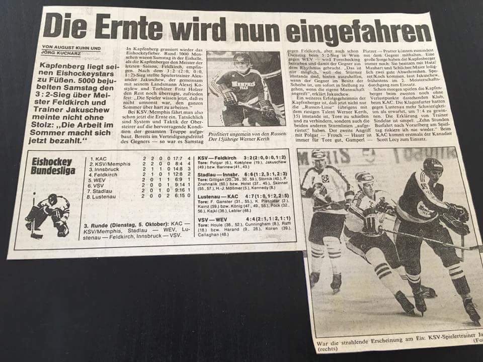 Hab es schon einmal vor Jahren gepostet, aber ich bin grad wieder über den Zeitungsartikel aus 1982 gestolpert und ich mag ihn sehr. Der KSV mit sowjetischen Spitzenhacklern und mehr Zuschauern als 90% der ICE-Vereine heute, auch viele der Torschützen der verschiedenen Vereine der damals aktuellen Runde im Artikel sind wohlbekannt. Alexander Jakuschew kam neben anderen Russen mit Anfang 30 direkt von Spartak Moskau und leider war ich noch zu klein, um mich an den Wahnsinn damals erinnern zu können, als die ganze Steiermark zu KSV-Spielen kam und die KSV Sektion Eishockey das sportliche Nr.1-Thema overall im Bundesland war.