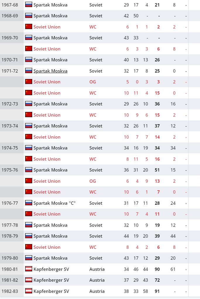 Ein zweiter war Martinjuk - der hat in einem WM Spiel gegen einen damaligen Underdog 8 Tore geschossen,und Gurejew war auch so einer -ich kann mich gut erinnern an diese Kapfenberger Mannschaften, hatte da schon etwa 10Jahre Fandasein am Buckel. Das war als Gegner nicht immer nett anzusehen, aber sehr eindrucksvoll