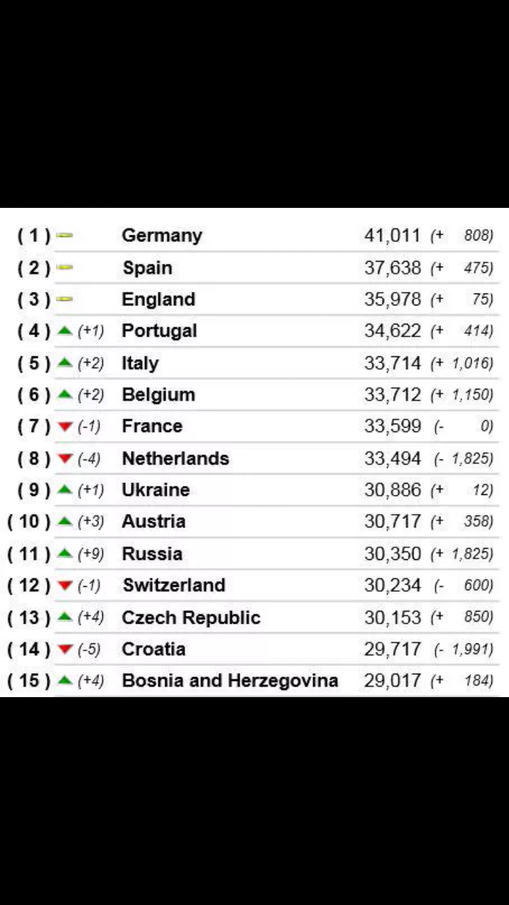 weil es jemand erwähnt hat: es gibt auch eine offizielle Uefa Rangliste die wird unterjährig aber anders berechnet als obige und ist deshalb etwas verwirrend, am Ende der EM Quali + Relegation sind dann beide Listen wieder gleich. Obige Liste rechnet kumulativ (von Runde zu Runde aufsummierend) die der Uefa auf Basis von Durchschnitt pro Runde. Beispiel: wenn AUT und RUS beide ausstehenden Spiele noch gewinnen ist RUS definitiv vor AUT sieht aber bei der Uefa Liste derzeit gar nicht danach aus.