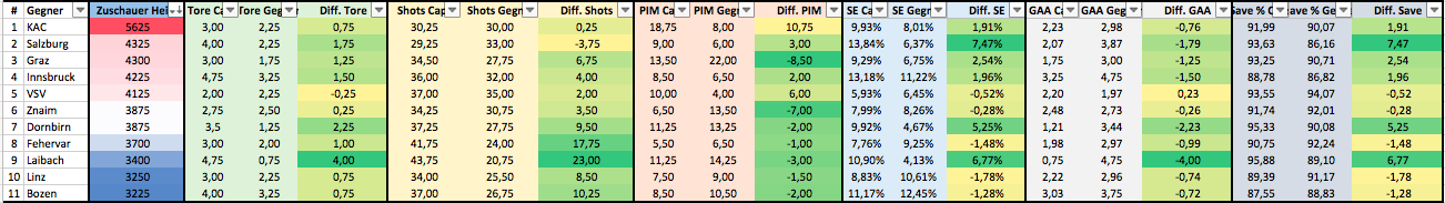 Wie immer können einige Werte hinterfragt werden, da es sich um die offiziellen EBEL Stats handelt. Zusätzlich wurde teilweise mit Mittelwerte gerechnet, wodurch die Zahlen teilweise nicht ganz genau sein werden. Es geht aber hauptsächlich um die Extreme und Unterschiede zu den anderen Duellen. Bei den Zuschauern wurde der Durchschnitt von den Heimspielen berechnet, während alle anderen Werte alle 4 Duelle beinhalten.