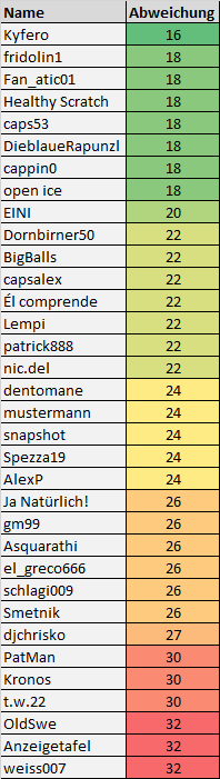 So, hier nun das Ergebnis aller abgegebenen EBEL 16/17 Rankings. Ich habe dafür einfach die jeweiligen Abweichungen eurer Prognose zum Ergebnis der Vorrunde aufsummiert. Ein Wert von 24 bedeutet somit, dass man die Teams insgesamt um 24 Plätze falsch gereiht hat. Eventuell gibt es elegantere statistische Methoden für so eine Berechnung, aber dafür fehlt mir im Moment die Zeit.