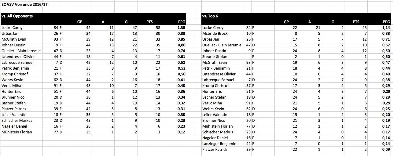 2) Tatsächlich ist das mit dem "Abstinken" von McGrath und Johner sehr interessant, denn schlussendlich wird auch der VSV entscheiden müssen, wie es nächste Saison mit dem Kader weitergeht. In Puncto passable Punktesammler gegen die BottomTeams hat der VSV eine große Auswahl: Johner, McGrath (Streitfall) und auch Latendresse. Vor allem Latendresse bringt für einen Legionär viel zu wenig. Seine 4 Punkte aus 10 Spielen gegen die Top6 beinhalten selbst ein EN, sonst wären wir überhaupt nur mehr bei O,33PPG.