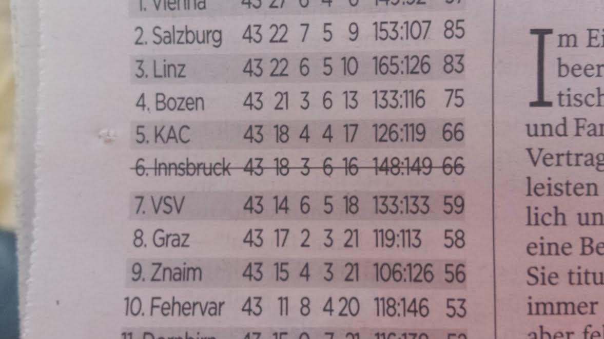 Ich würde uns übrigens für die Top 6 noch nicht ganz abschreiben, denn offensichtlich überlegt die Liga einen Ausschluss der Innsbrucker Haie. Die Kleine Zeitung ist natürlich wie immer top informiert und hat die Tiroler schon mal in der Tabelle durchgestrichen.