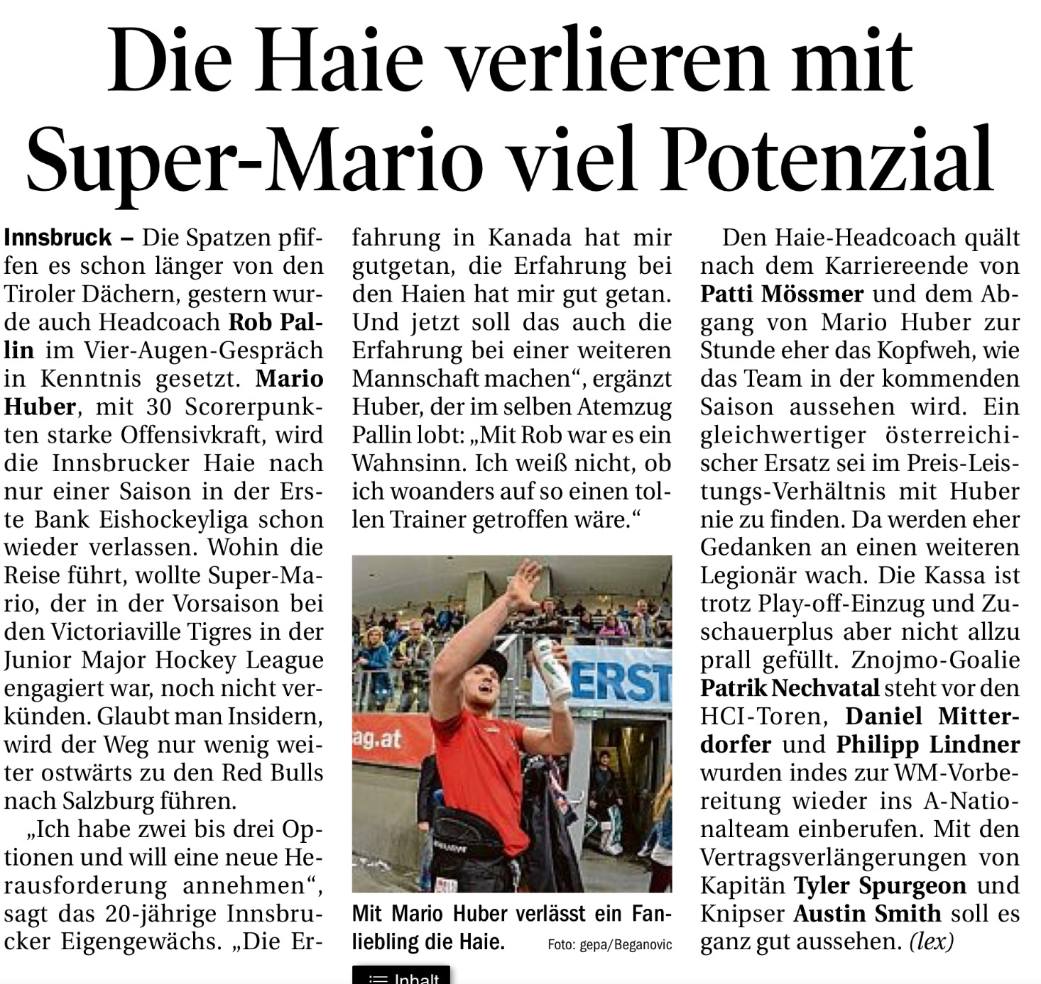 Schade bzgl. Mario Huber - aber denke Salzburg wird ihm gut tun