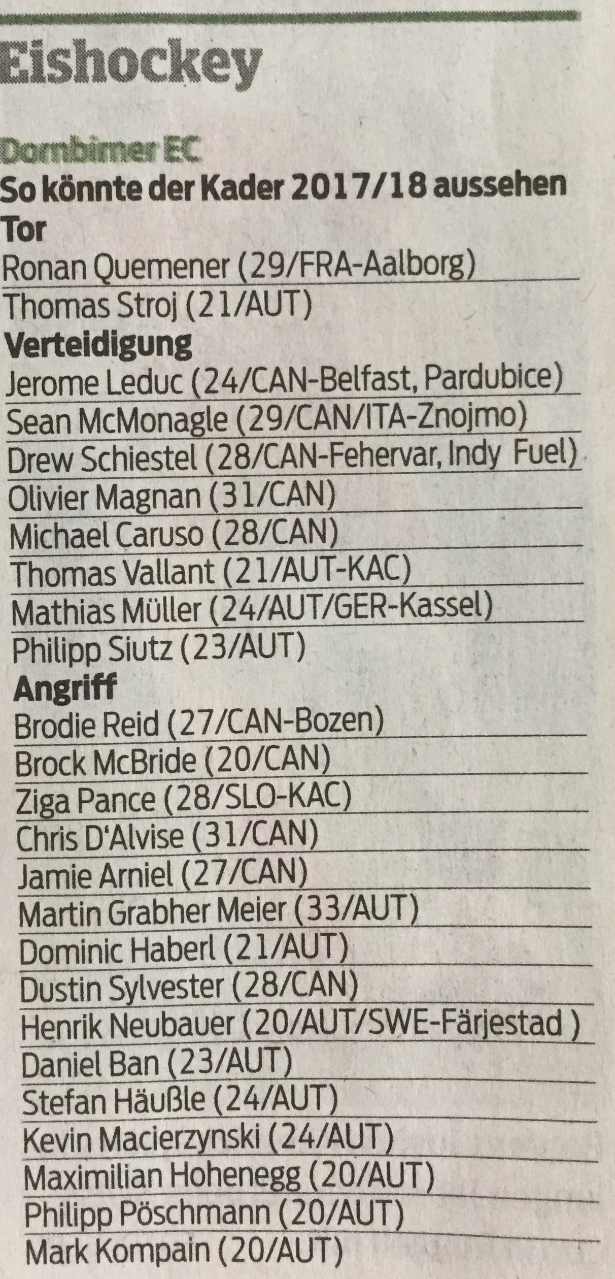 Ziga Pance (Stürmer, davor KAC), Schiestel (Verteidiger, davor Fehervar), Mathias Müller (Verteidiger, Deutsch- Österreicher aus DEL2) sollen künftig für uns spielen.:thumbup: