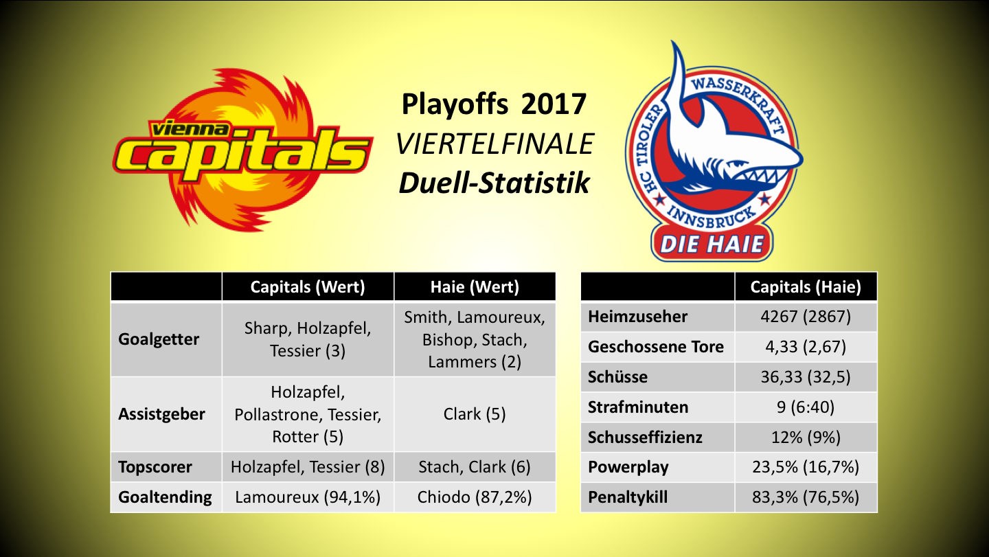Einige Statistiken zum Viertefinalduelle zusammengefasst. Die Werte beziehen sich ausschließlich auf die direkten Duelle. Fehler können sich natürlich wie immer eingeschlichen haben. Die Save-Percentage von Litterbach (92,7%) im letzten Duell habe ich vernachlässigt, da er vermutlich nicht spielen wird und daher irrelevant ist. Kickert hatte nur einen Einsatz beim 7:9 in Wien, sonst war in jedem Duell gegen Innsbruck Lamoureux der Starting-Goalie. Der Heimzuseherschnitt ist bei den Caps übrigens der 4.-beste aller Duelle, hinter dem KAC, Salzburg und Graz.