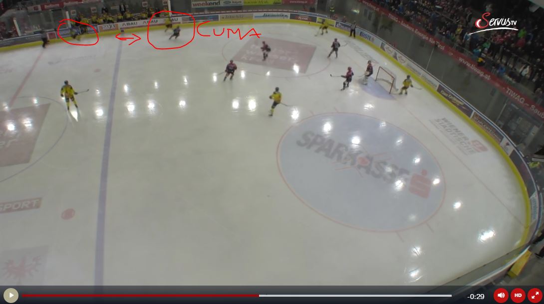 Cuma passt den Puck, aber der Spieler, den er ersetzt hat, kristelt erst vor den Bank ab. Knapp, aber doch too many man hier. Außerdem war Cumas Ersatz noch nicht in der Wechselzone, als er das Eis betreten hatte. Also eigentlich doppelt Too Many Man.