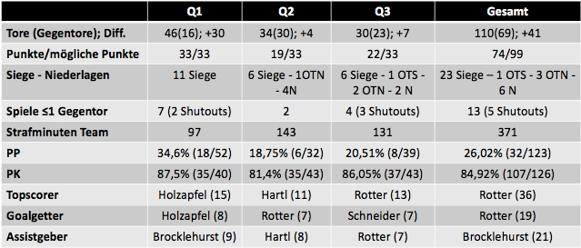 • Auch wenn der Grunddurchgang etwas "schwächer" als im Vorjahr war, kann man rundum zufrieden sein. 93 Punkte, 146 Tore geschossen (3. bester Wert), 97 Tore erhalten (bester Wert, als einziges Team unter 100, Szbg. 2. mit 116 Gegentoren), 30 Siege und die CHL Quali. Das passt.