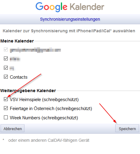 Unter "Weitergegebene Kalender" taucht jetzt der VSV Kalender auf, hier das Häckchen aktivieren und auf speichern.
