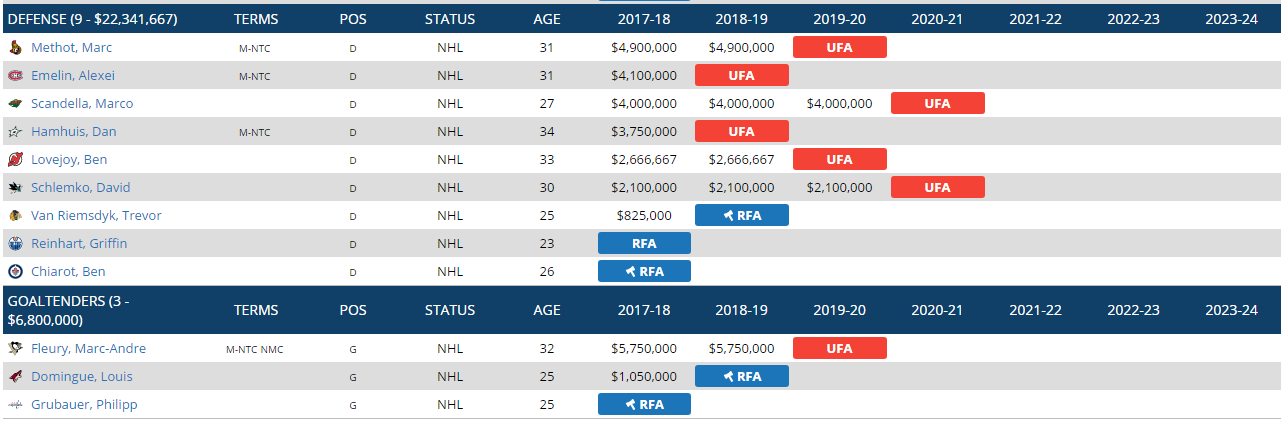 Den Cap Hit halte ich noch niedrig... da ist für die kommenden Jahre noch genug Luft nach oben. Ansonsten gehe ich auch in die Richtung, dass ich in der Abwehr einen mehr hole als vielleicht nötig. Hamhuis und Emelin vielleicht auch nur fürs 1. Jahr und dann gar nicht mehr.