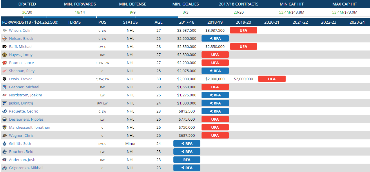 Bei manchen Teams tu ich mir hart, dass ich überhaupt irgendwen finde (Colorado, Toronto... da hab ich irgendwen gepickt... als Profi nimmt man sich halt den, der am ehesten ein guter Prospect ist ;)). Stattet man die RFA Grigorenko und Anderson noch mit Verträgen aus, schaffe ich den neuen Cap Floor von 55.4 Mio auch locker.