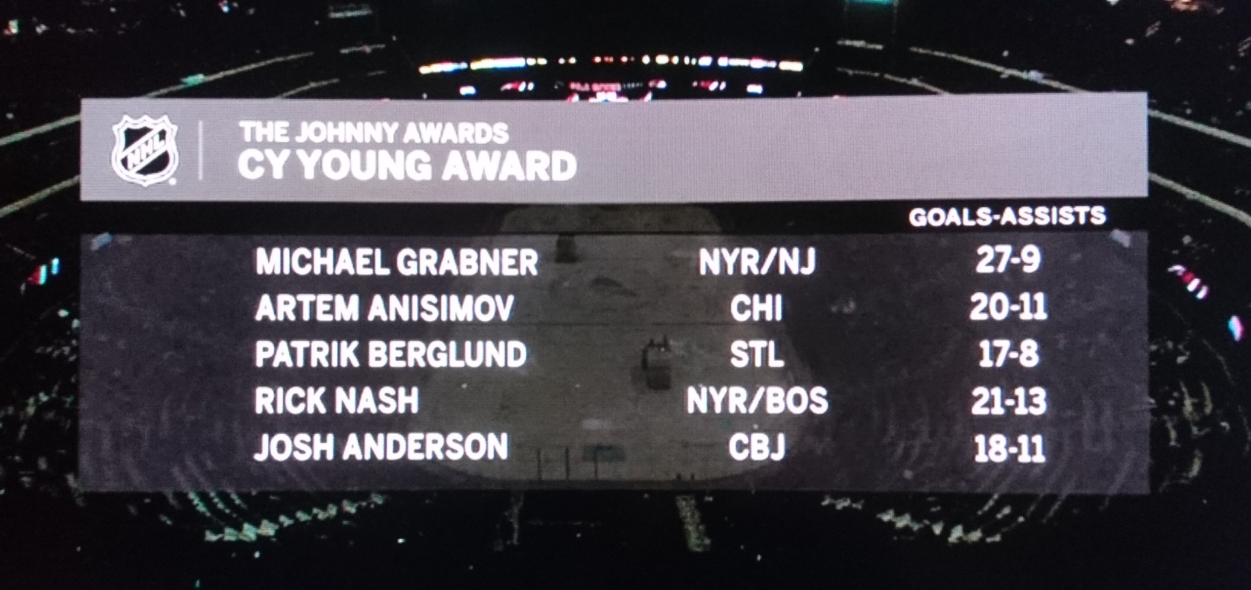 Grabner hat den cy young award gewonnen. Der Spieler mit der größten Differenz zwischen erzielter Tore und Assists.