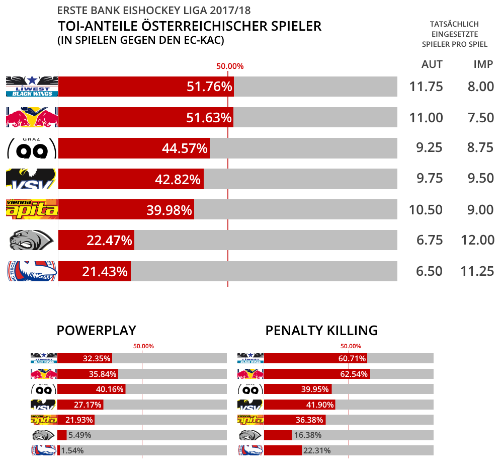KAC im Vergleich mit Österreicher-Anteil an TOI: gesamt 61.91%, rein im PP 55.30%, rein im PK 62.25%.