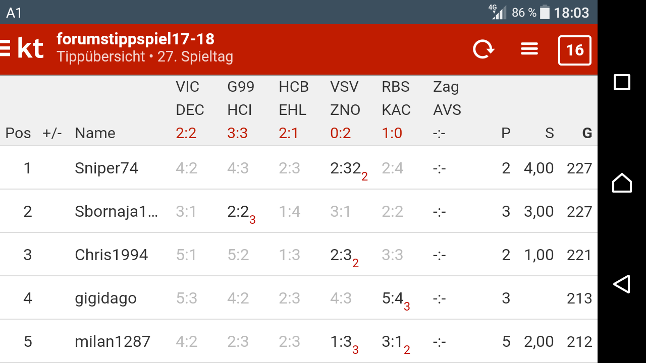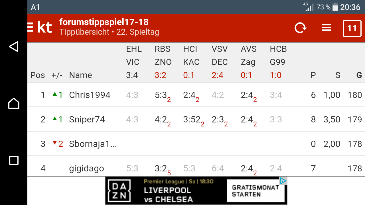 Standardmäßig bekommt man bei einem Sieger nach 60 min. 2 Punkte für die Tendenz, 3 für das Torverhältnis und 4 für das genaue Ergebnis bzw. bei einem Unentschieden 2 für die Tendenz und 4 für das genaue Ergebnis. Soll diese Punktevergabe beibehalten werden oder sind Anpassungen gewünscht? Getippt werden wie in den vorherigen Jahren alle EBEL Spiele, inklusive Zwischenrunde und Playoff, das getippte Ergebnis bezieht sich auf den Spielstand nach 60 Minuten, deshalb auch Unentschieden. Das genaue Regelwerk sollte jedoch auch direkt auf Kicktipp ersichtlich sein, sollte jemand Vorschläge zu etwaigen Regeländerungen haben oder gefundene Fehler meinerseits finden: her damit!