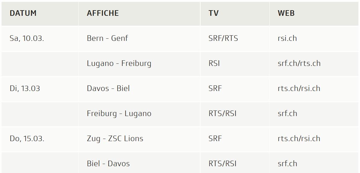 Die ZSC Lions sicherten sich (wie Davos trotz Niederlage) mit dem dritten Sieg innert vier Tagen das Playoff-Ticket. Fribourg steht nach dem Erfolg im Zähringer Derby kurz davor. Den letzten Platz dürften Servette und die SCL Tigers unter sich ausmachen. Im ersten Spiel nach der Olympia-Pause kommt es zum Direktduell, danach spielen die Genfer zweimal gegen Leader Bern, die Emmentaler zweimal gegen Schlusslicht Kloten.