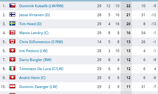 Zwerger übrigens aktuell an dritter Stelle der Scorerwertung bei Ambri bzw. gemeinsam mit Joly bester Goalgetter. Die +/- Statistik liest sich trotz des bisher "gebrauchten" Saisonverlaufs mit +2 gerade im Vergleich zu seinen Teamkollegen auch nicht so schlecht.