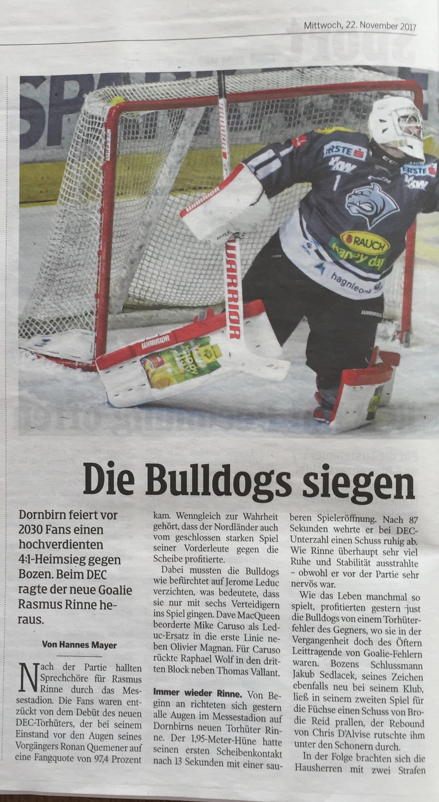 Jedenfalls redet er viel mit der Defense und teilt Lob und Tadel gleichermaßen aus, gibt Anweisung und Feedback. Das gefällt mir und habe ich in diesem Ausmaß noch nie bei einem Goalie in Dornbirn wahrgenommen.