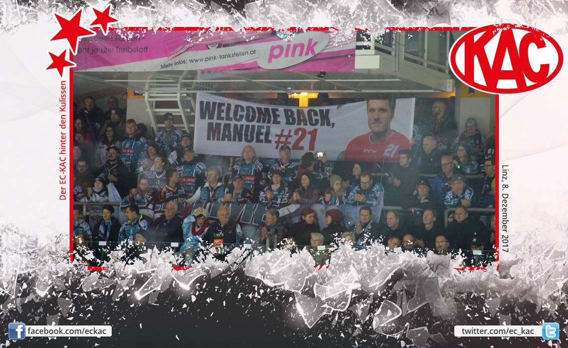 vom fanclub overtime gabs heute eine schöne aktion zu spielbeginn. es wurde ein banner mit der aufschrift "welcome back manuel #21" hoch gehalten. wurde auch vom kac auf fb gelostet und honoriert. sehr sportlich und faire geste.