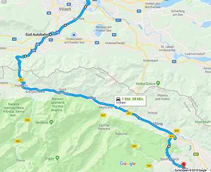 Vom Autobahn-Konten Villach Richtung Italien / da die Ausfahrt Warmbad Villach und auf der Bundesstraße über den Wurzenpass (ist ein bischen eine Kurverei -wäre ideal mit dem Bike :)) - dafür sparst du dir die Tunnelgebühr. Immer Richtung Jesenice (bei Kranjsa Gora vorbei).