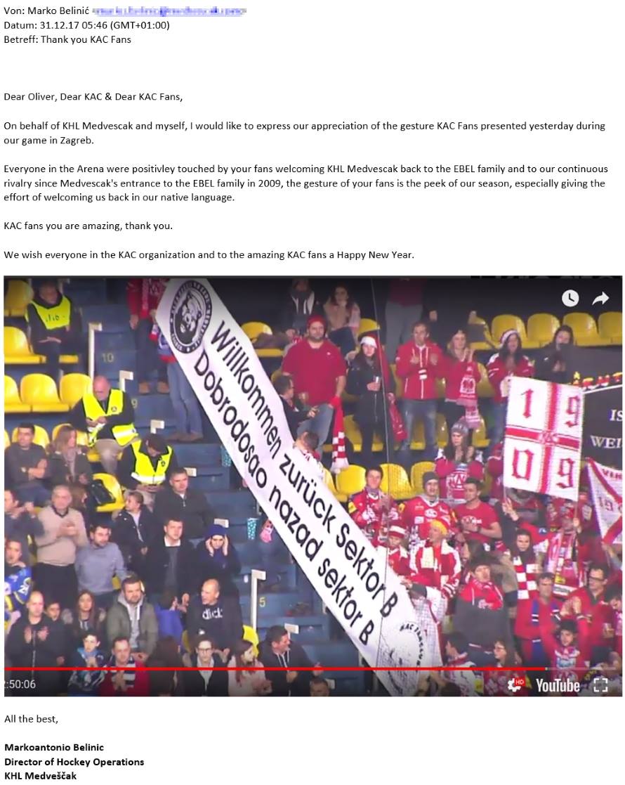 Dieses E-Mail erreichte uns heute am Morgen vom Medveščak-Sportdirektor Markantonio Belinić. Danke an die #Rotjacken-Fans, die gestern die Reise nach Zagreb auf sich genommen und sich dort (trotz Widrigkeiten bei der Hinfahrt) vorbildhaft benommen haben. Und danke dem KAC Fanclub Vikings für das Produzieren dieses Banners. (HB)