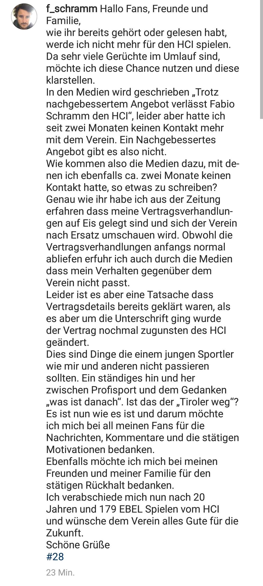 Hier die Stellungnahme von Fabio Schramm auf Instagram zu den Vertragsverhandlungen zwischen ihm und dem HCI. Ich kenne keine Internas oder Details, die Wahrheit wird wahrscheinlich irgendwo in der Mitte zwischen der Aussendungen des Vereins und seiner Stellungnahme liegen.