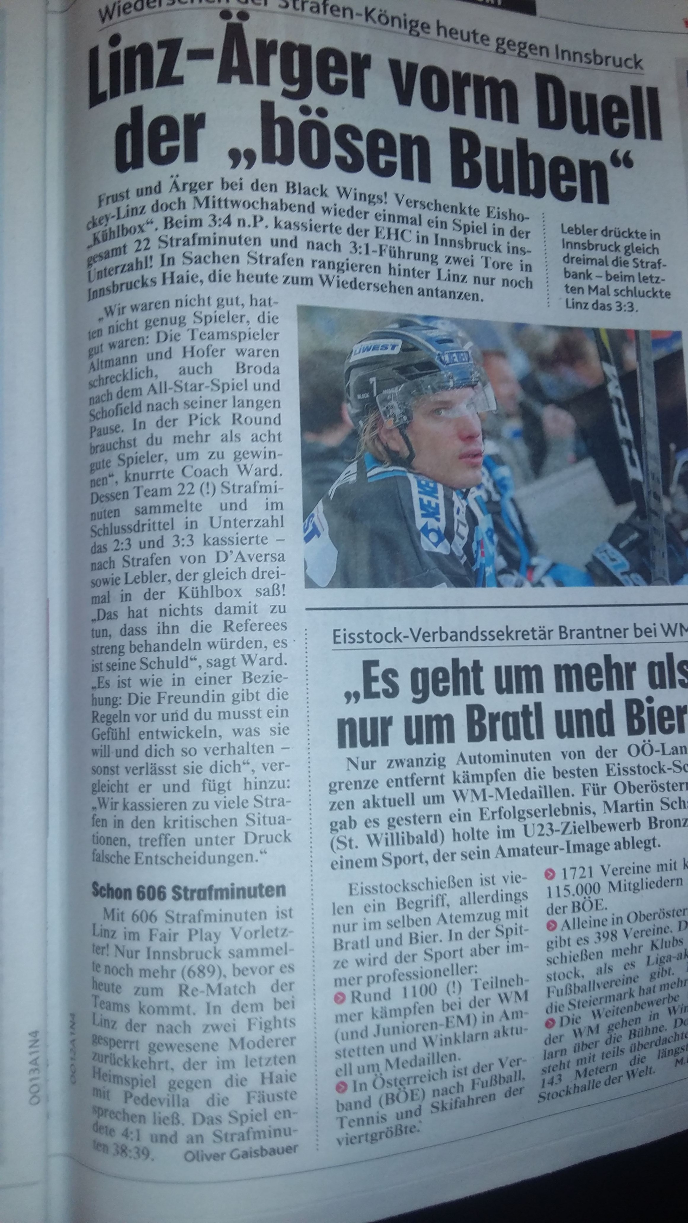 "Wir haben zu viele unnötige Strafen genommen. Jeder Spieler, der Eishockey auf Profi-Niveau spielt, muss sich und sein Spiel an die Referees anpassen können. Einmal pfeifen sie etwas kleinlicher, ein anderes Mal lassen sie mehr durchgehen. Aber so ist das, Schiedsrichter sind auch nur Menschen. Ich war von der Leistung in Innsbruck enttäuscht."