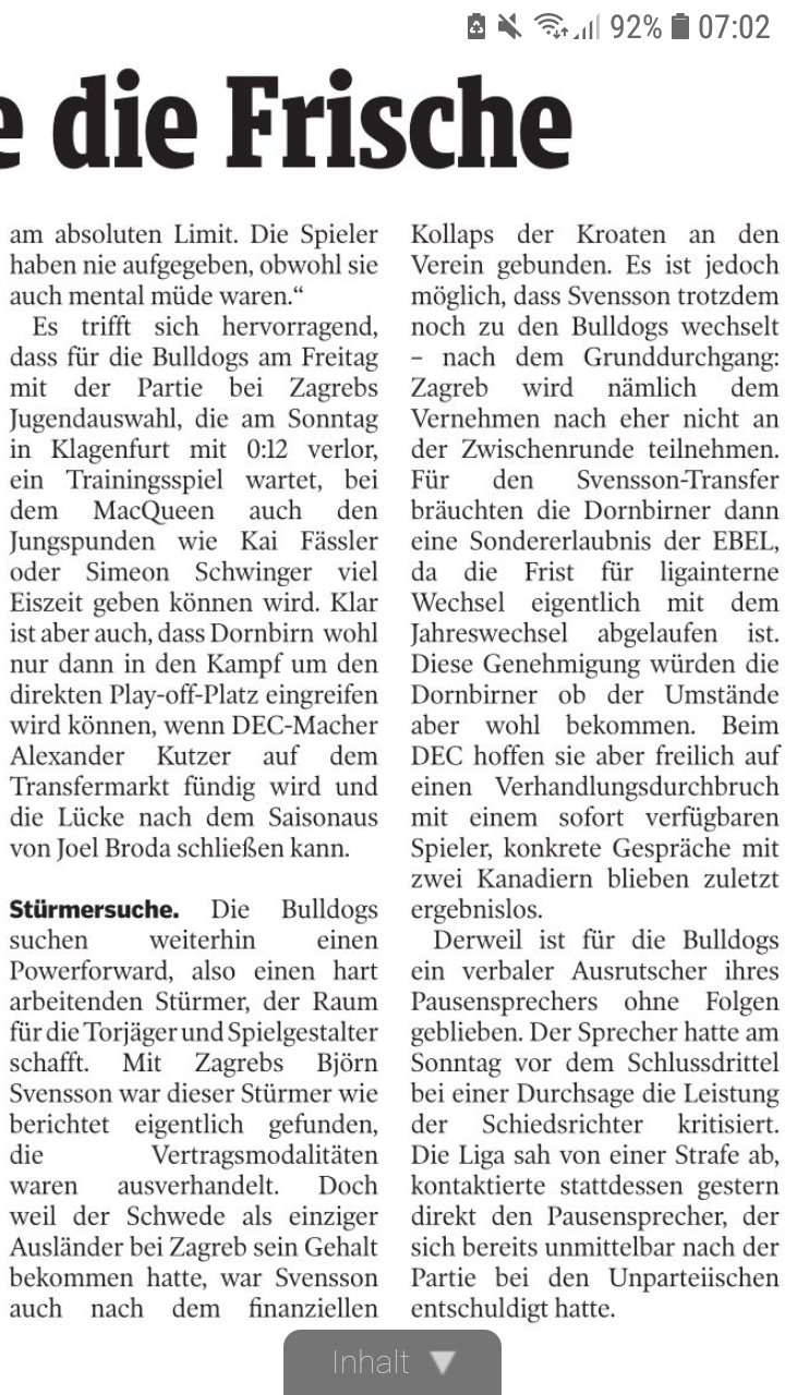 Ich denke nicht das Schlüsselspieler (Trotter, O'Donnell, Reid, Timmins, ..) zur VEU wechseln würden. Und wenn doch wäre das nicht all zu tragisch, das Leistungsträger verschwinden ist man in Dornbirn gewohnt. Schwerer zu verkraften wären Transfers von Macierzynski, Häußle, etc.
