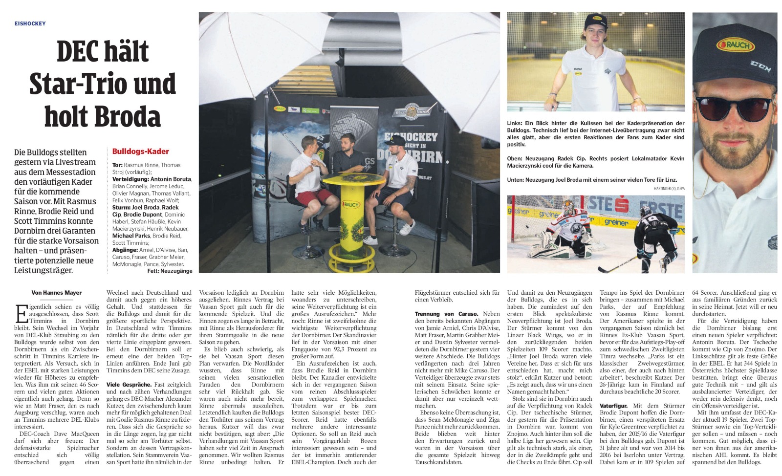Vom Roster her bisher nen richtig guter Kader. Speziell Rinne Timmins Reid Häusle und Conelly wichtig (natürlich auch die anderen Weiterverplichtungen) und bisher gut dazu verpflichtet.