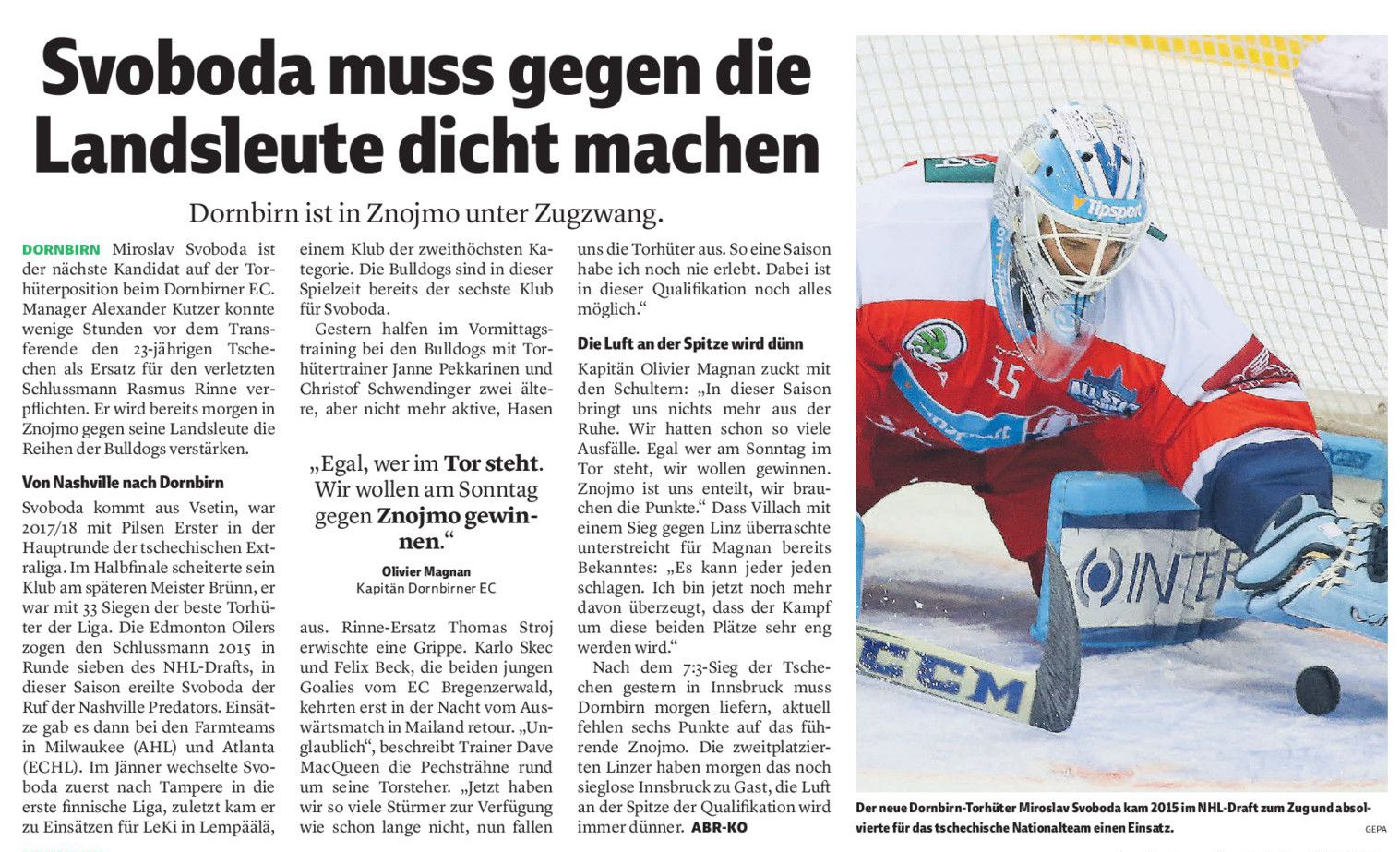 Der 23-jährige Miroslav Svoboda wird ab sofort bis Saisonende das Tor der Bulldogs hüten. Die Vorarlberger mussten auf eine erneute Verletzung von Stamm-Keeper Rasmus Rinne im Eiltempo reagieren. Am Sonntag gastieren die Bulldogs in einer richtungsweisenden Partie beim HC Orli Znojmo.