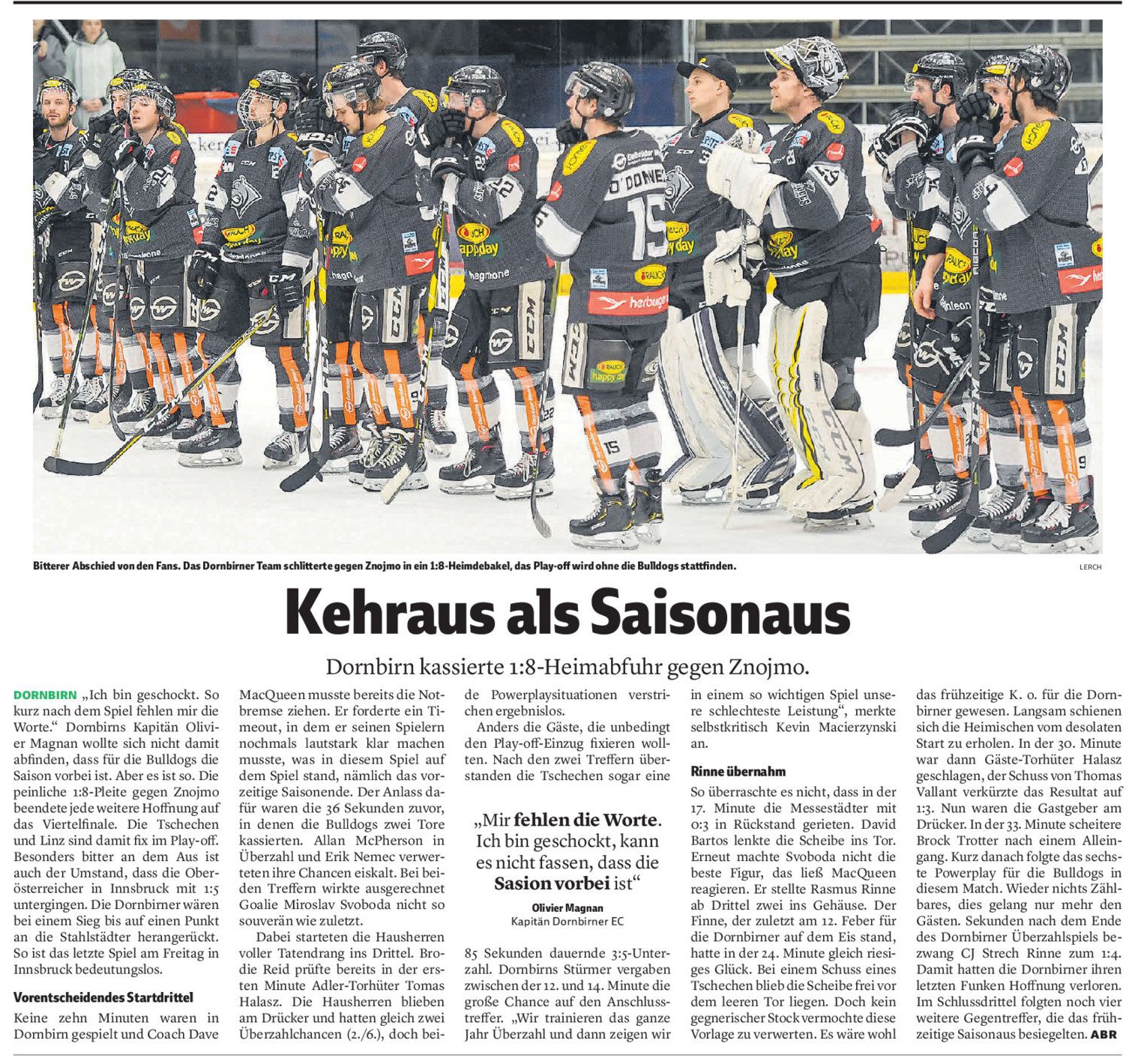 Laut der „Neuen“ soll MacQueen in Zukunft nicht mehr die Bulldogs betreuen, er könnte aber als Sportdirektor erhalten bleiben. Für Alexander Kutzer ist das aktuell alles noch kein Thema, er möchte einmal die Saison aufarbeiten. Auch die Spielerverträge stehen nun an erster Stelle. Trotter und O´Donnell möchte man natürlich halten, allerdings wird das wohl nicht leicht werden für die Vorarlberger. Und angeblich könnte in Innsbruck nach Ersatz Ausschau gehalten werden, Andrew Clark bzw. Andrew Yogan Thema sein. Laut der „Neuen“ nicht mehr mit dabei im Kader sind: Michael Parks, Alexandre Picard, Rob Bordson und Joel Broda. Rasmus Rinne hat Vertrag bis 2020 und auch Magnan wird wohl bleiben.