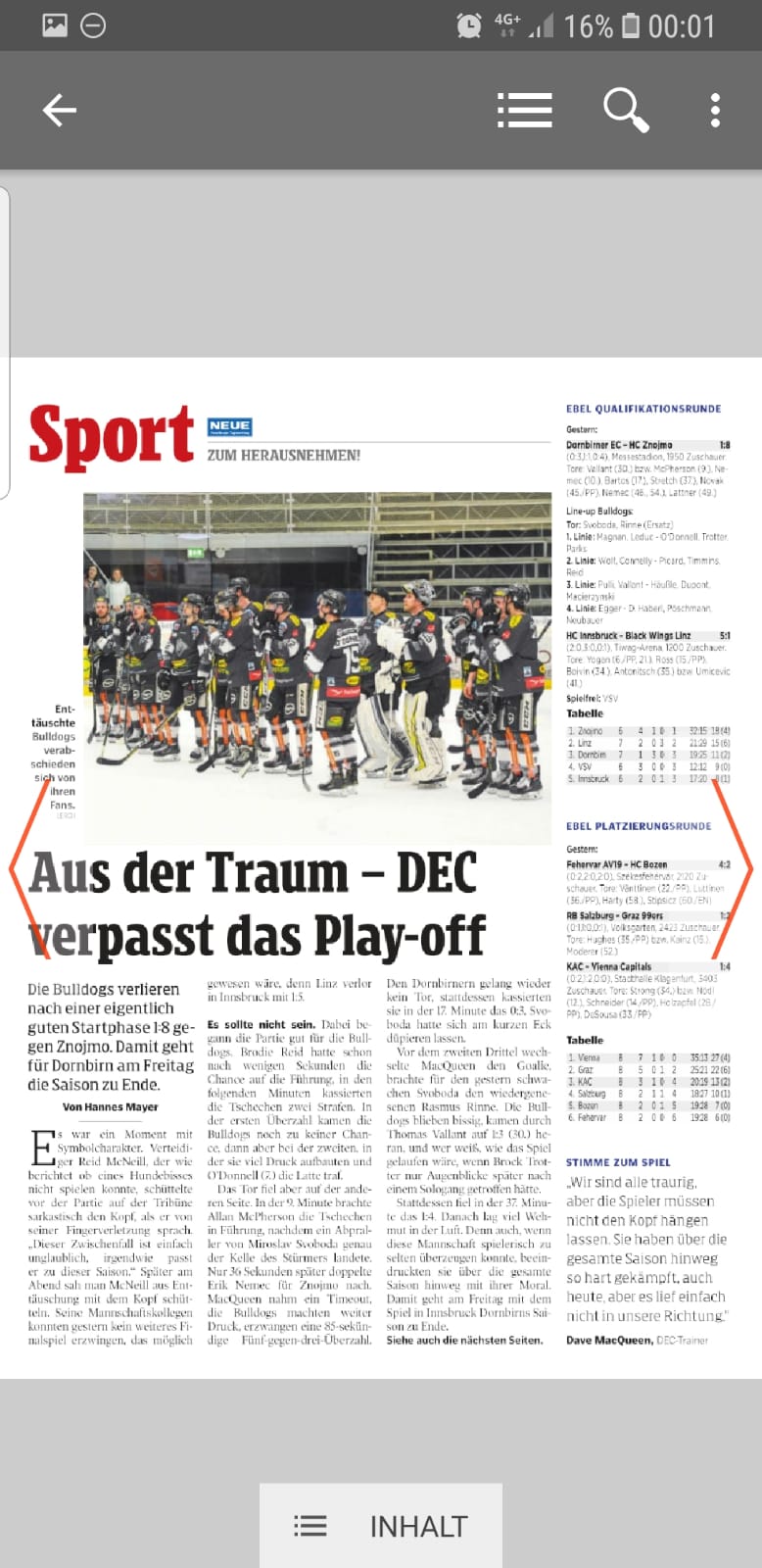 Laut der „Neuen“ soll MacQueen in Zukunft nicht mehr die Bulldogs betreuen, er könnte aber als Sportdirektor erhalten bleiben. Für Alexander Kutzer ist das aktuell alles noch kein Thema, er möchte einmal die Saison aufarbeiten. Auch die Spielerverträge stehen nun an erster Stelle. Trotter und O´Donnell möchte man natürlich halten, allerdings wird das wohl nicht leicht werden für die Vorarlberger. Und angeblich könnte in Innsbruck nach Ersatz Ausschau gehalten werden, Andrew Clark bzw. Andrew Yogan Thema sein. Laut der „Neuen“ nicht mehr mit dabei im Kader sind: Michael Parks, Alexandre Picard, Rob Bordson und Joel Broda. Rasmus Rinne hat Vertrag bis 2020 und auch Magnan wird wohl bleiben.