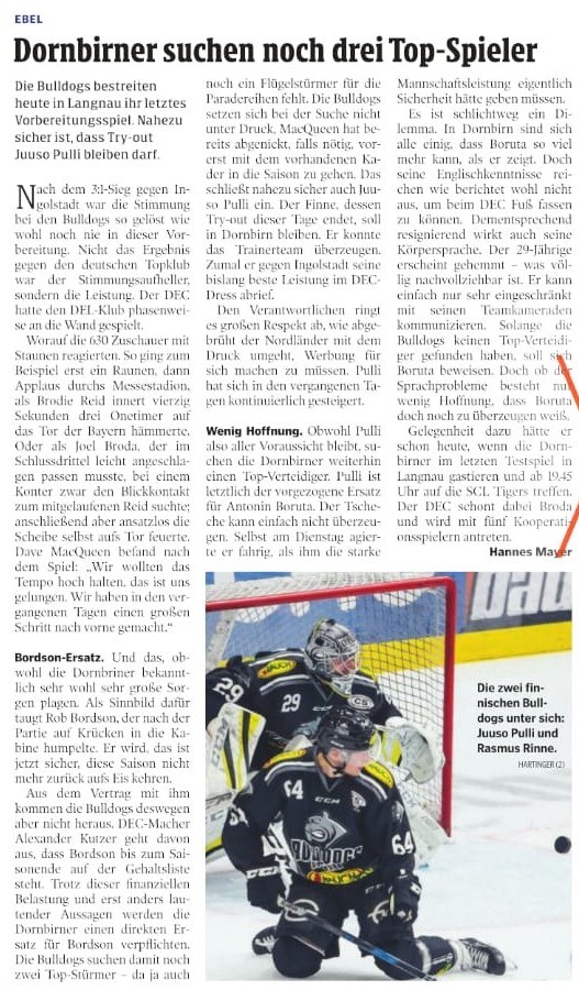 Spannend wird es bis dahin trotzdem bleiben, insbesondere wie die Defensive aussehen wird. Fechtig ja kein Kooperationsspieler (zu alt). Ob mit Pulli der gewünschte Verteidiger für die erste Linie gefunden wurde ist fraglich. Auch offensiv fehlt ja noch immer einer (oder gar zwei sofern Bordson tatsächlich die ganze Saison fehlt?)