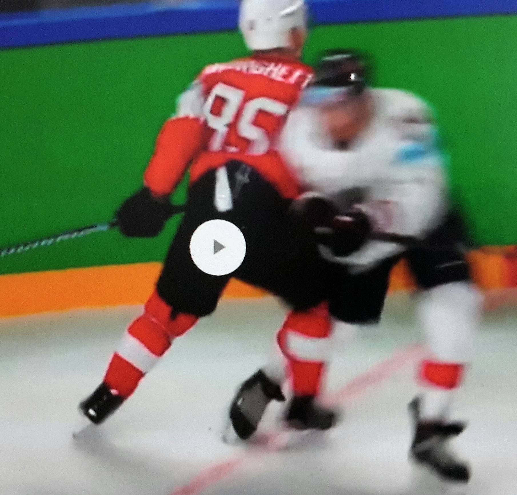 Und das ist es ja, was mich in diesem Fall so auf die Palme gebracht hat. Andrighetto hat direkt nach dem Torschuss beide Beine durchgestreckt und beide Kniee ausfahren. Deshalb hat er auch nur noch gleiten und nicht mehr eislaufen können. Und mit beiden Knie voran ist er in Strong hineingefahren.