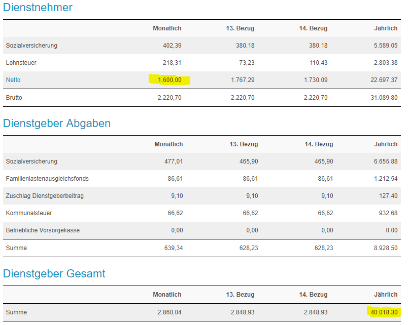 laut https://www.bruttonetto-rechner.at sind 1600 "Netto" Dienstgeberkosten von 40k pro Jahr :P