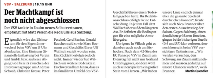 Der Status quo beim VSV: Geschäftsführer und Vorstand Ulf Wallisch verweigert nach wie vor seinen Rücktritt. Die "Putsch-Gruppe" um Andreas Schwab, Christian Kresse sowie Peter Peschel stellt ein Ultimatum nach dem anderen. Besonders das Tempo, das die Interessensgemeinschaft hinsichtlich VSV-Übernahme vorgibt, sorgt allerorts für Erstaunen. Und dazu kämpft Wallisch mit einem Schicksalsschlag im engsten Familienkreis. Es ist nicht ausgeschlossen, dass diese Woche bei den Blau-Weißen noch lange nachhallt.