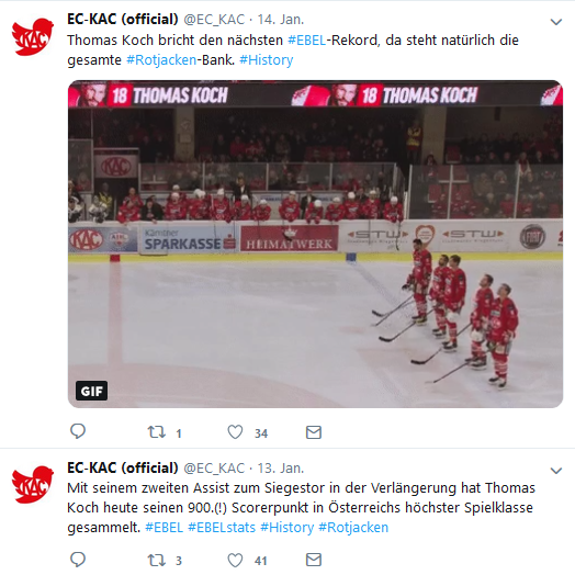 Mit seinem zweiten Assist zum Siegestor in der Verlängerung hat Thomas Koch heute seinen 900.(!) Scorerpunkt in Österreichs höchster Spielklasse gesammelt. #EBEL #EBELstats #History #Rotjacken