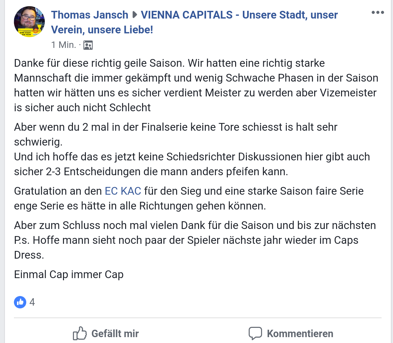 Feierts brav und auch DANKE an die normalen Fans des Kac die fair geschrieben egal ob Sieg oder Niederlage