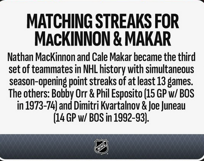Nathan MacKinnon and Cale Makar kept rolling to start 2024-25 as they each recorded a point in their 13th straight game to begin the season and joined a rare…