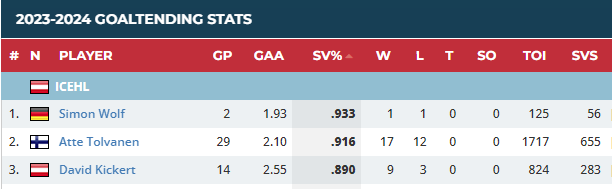 Kicks ist da deutlich schlechter als Tolvanen, seine SV% ist richtig gruselig. Da hätten ihn die Starts beim NT als quasi 1er Goalie von Österreich schon was gebracht. 14 Pflichtspiele bis Mitte Feber ist ja auch praktisch nichts. Wir haben keinen 1er Goalie als Nationalgoalie und dann erklärt dir der zumindest nominelle 1er von Österreich, dass er keine Lust aufs NT hat.